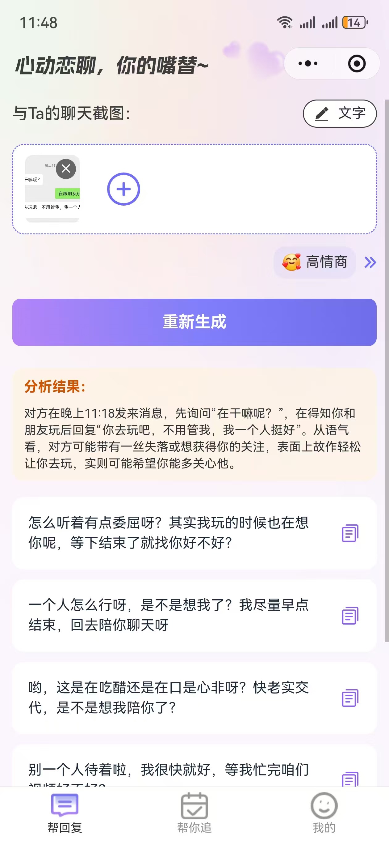 我将这句消息直接截图上传至工具的【多模态截图分析】模块,无任何额外Prompt指令,模型自动完成「文本解析+情绪识别+潜台词拆解」,给出最优解回复: