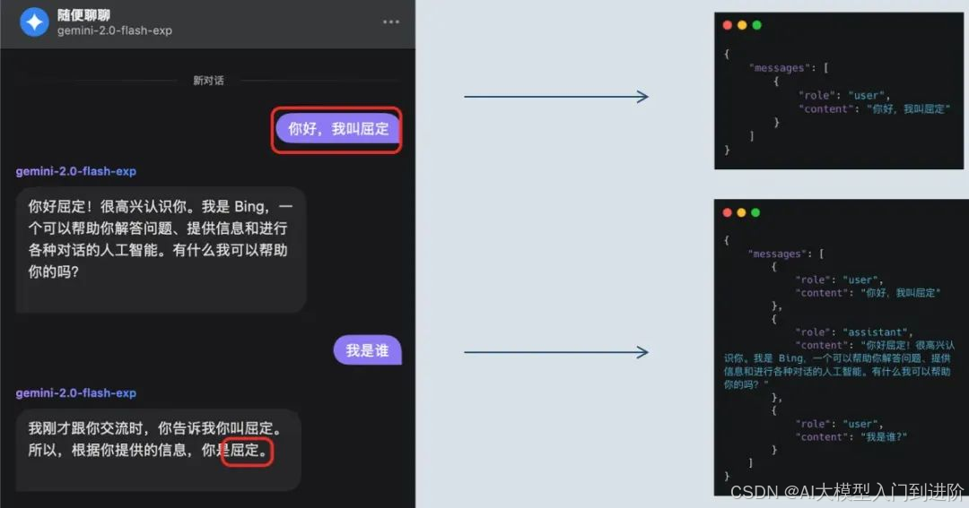 大模型所谓的对话记忆实际上就是依赖该数组做信息传递,如下图所示,第一轮我告诉我的名字叫屈定,第二轮的时候在问他是谁,他已经知道了我的名字,之所以知道因为我在messages的上下文中传递给了他这个信息。
