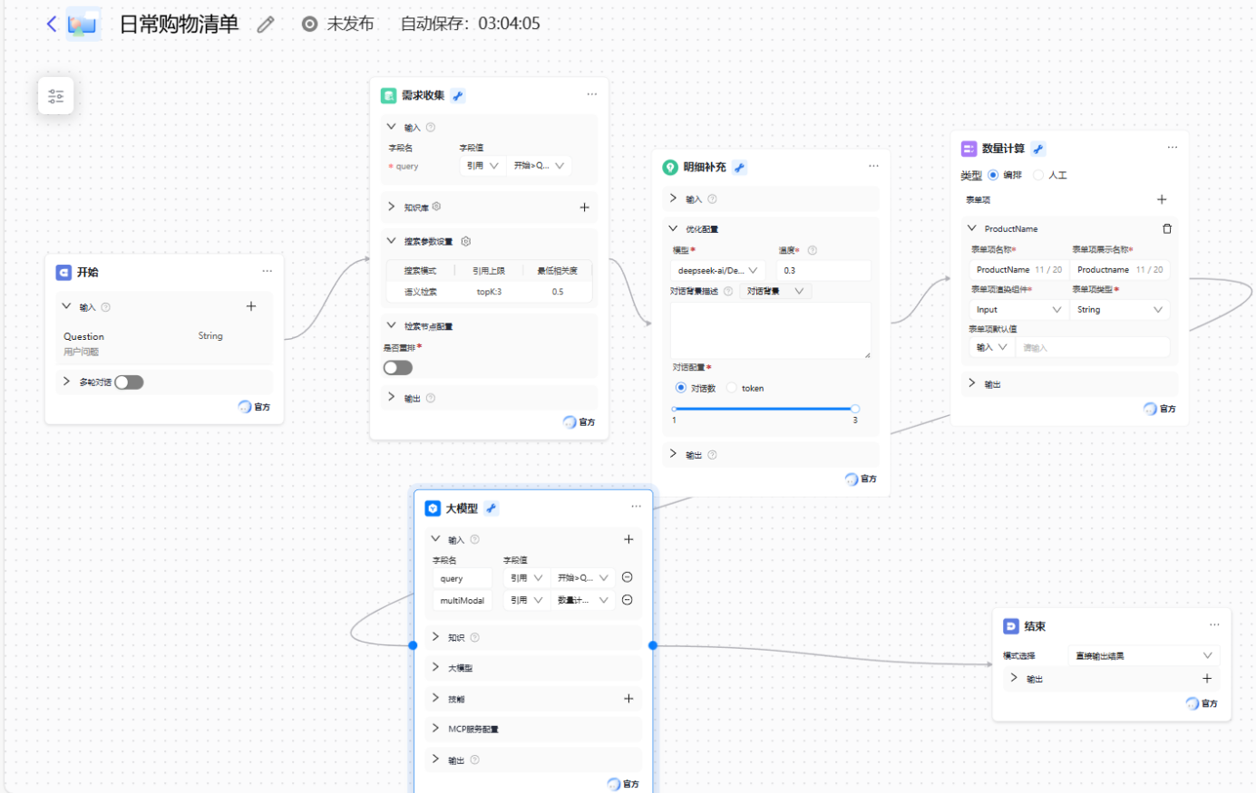 通过简单拖拽连线,各个节点依次衔接:用户输入“3人周末烧烤”后,“需求收集”先确定“烧烤食材、炭火、蘸料、饮品”方向,“明细补充”列出具体物品,“数量计算”最终输出带数量的清单,全程无需代码,直观完成从需求到结果的流程编排。