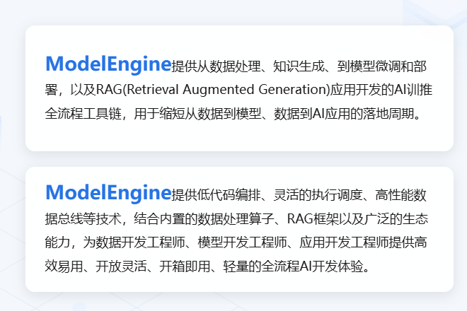 ModelEngine 最核心的优势在于构建了端到端的 AI 开发流程,彻底打破传统开发中各环节的壁垒,实现从数据处理到行业应用落地的全流程贯通。其全流程 AI 训推工具链,覆盖数据处理、知识生成、模型微调和部署,以及 RAG(Retrieval Augmented Generation)应用开发等关键环节,有效缩短了从数据到模型、从数据到 AI 应用的落地周期。同时,平台整合低代码编排、灵活执行调度、高性能数据总线等核心技术,搭配内置的丰富数据处理算子、RAG 框架及广泛的生态适配能力,为数据开发工程师、模型开发工程师、应用开发工程师三类核心用户,提供了高效易用、开放灵活、开箱即用的轻量型全流程开发体验。
