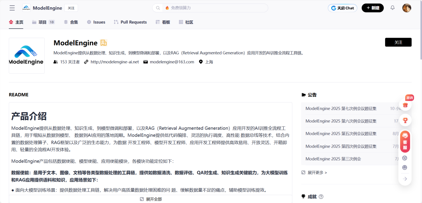 并且,ModelEngine 开源版本的推出进一步降低了 AI 开发门槛。目前代码已托管于 GitHub、Gitee、GitCode 等多个主流平台,全球开发者均可免费获取和使用。这种开源精神不仅践行了技术共享理念,更促进了开发者之间的协作交流——尤其为中小型企业和初创公司提供了宝贵的技术资源,帮助其减少研发投入、缩短产品上市周期,推动 AI 技术的普及与创新落地。