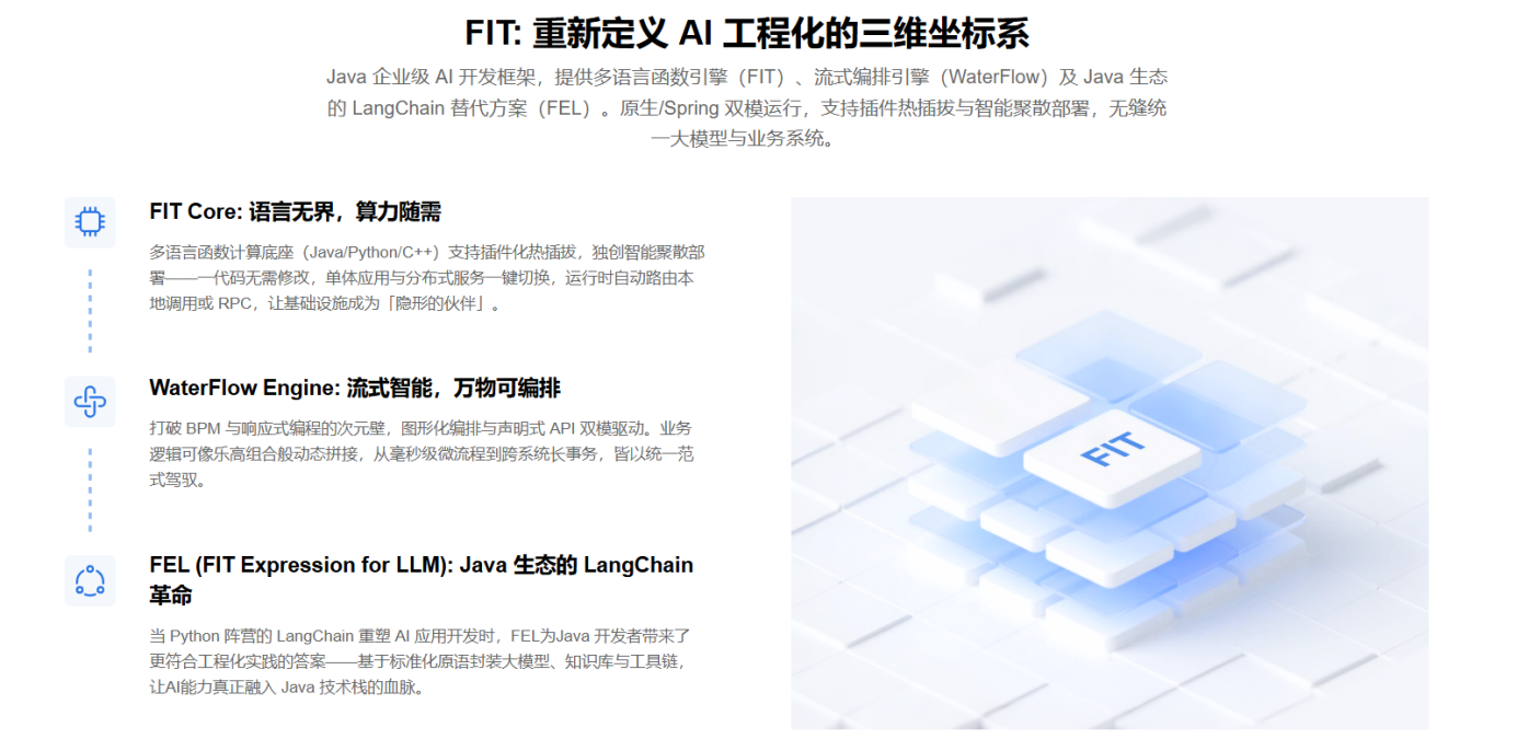 ModelEngine 作为全流程 AI 开发工具链平台,凭借端到端全流程能力打通数据处理至应用部署全链路,以 FIT 多语言底座、WaterFlow 流式编排引擎、FEL 表达式框架三大技术创新突破传统开发痛点。它并非只是一个 AI 智能体开发平台,**而是一套覆盖“数据-模型-应用-生态”的全栈式 AI 工程化解决方案**。未来,随着社区生态的持续繁荣与技术的不断迭代,ModelEngine 将继续深耕 AI 工程化领域,为全球开发者提供更强大、更易用的全流程 AI 开发工具链,共同构建智能未来的坚实支柱。