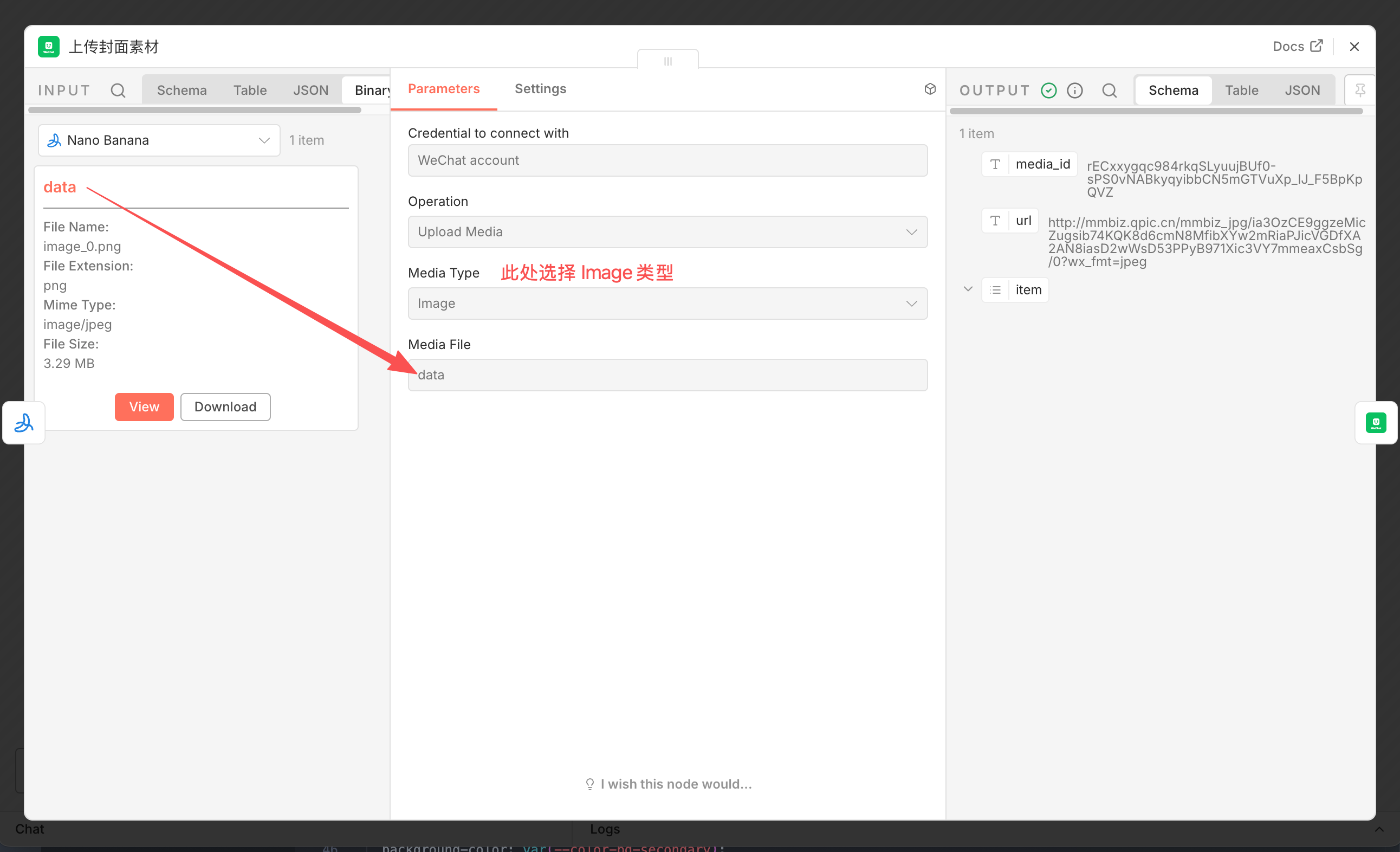 添加 Upload Media 节点,把刚才生成的四格漫画图片上传到微信服务器,拿到一个 media_id,设置公众号的封面需要用到这个 id。