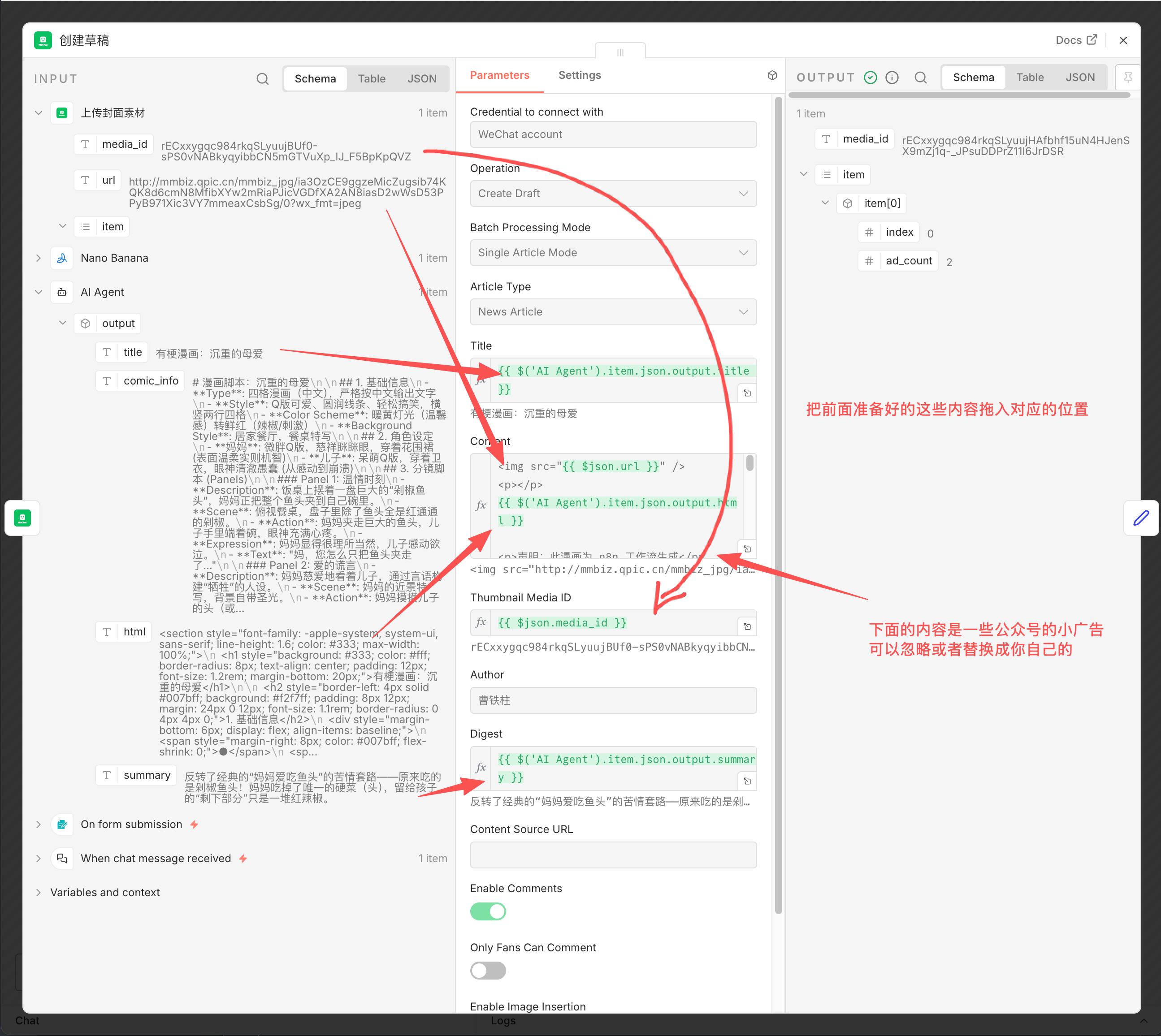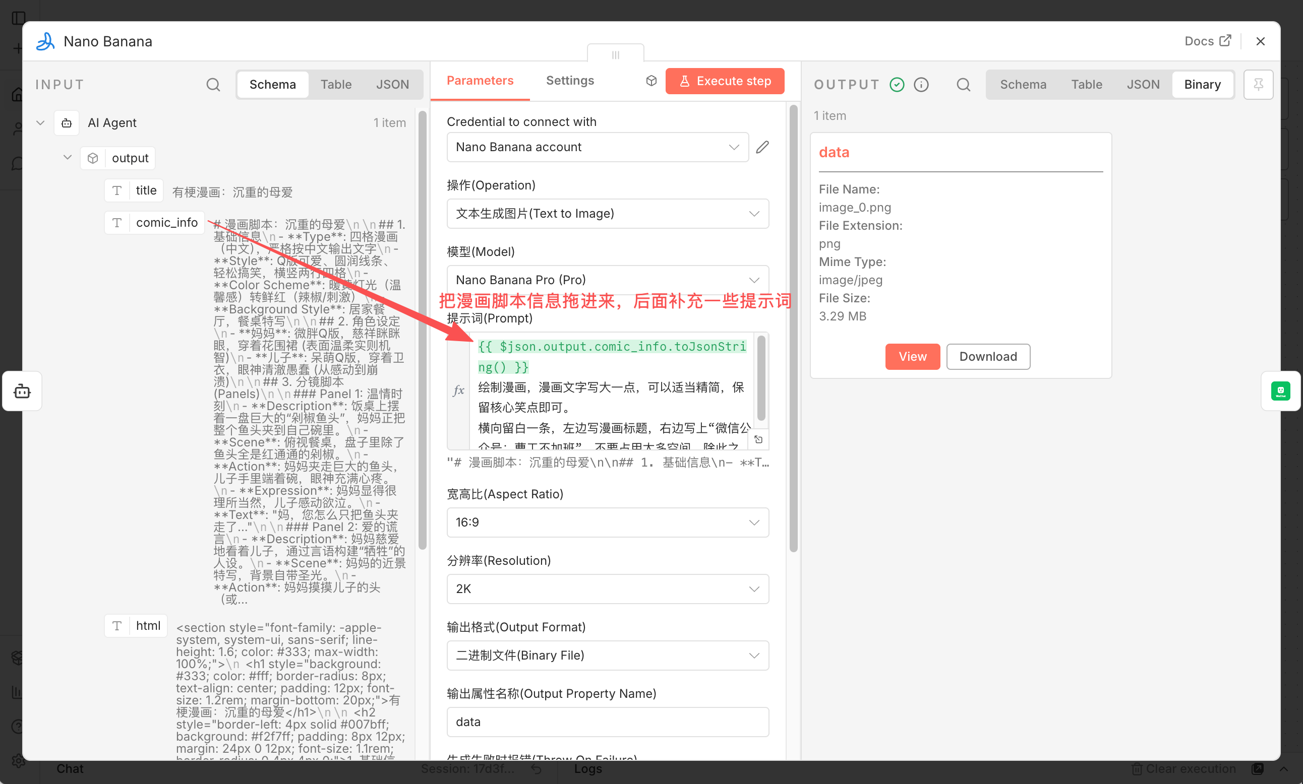 把前面 AI Agent 节点输出的漫画信息拖到 prompt 输入框中。