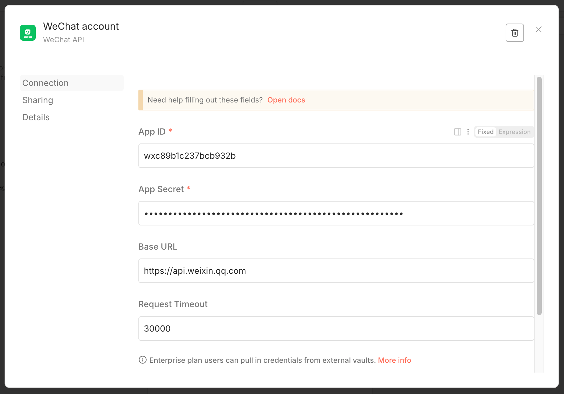 安装以后先创建一个公众号的链接凭证,需要前往微信开发者平台获取 App ID 和 App Secret,并且把运行 n8n 的电脑的 IP 配置到 IP 白名单内。