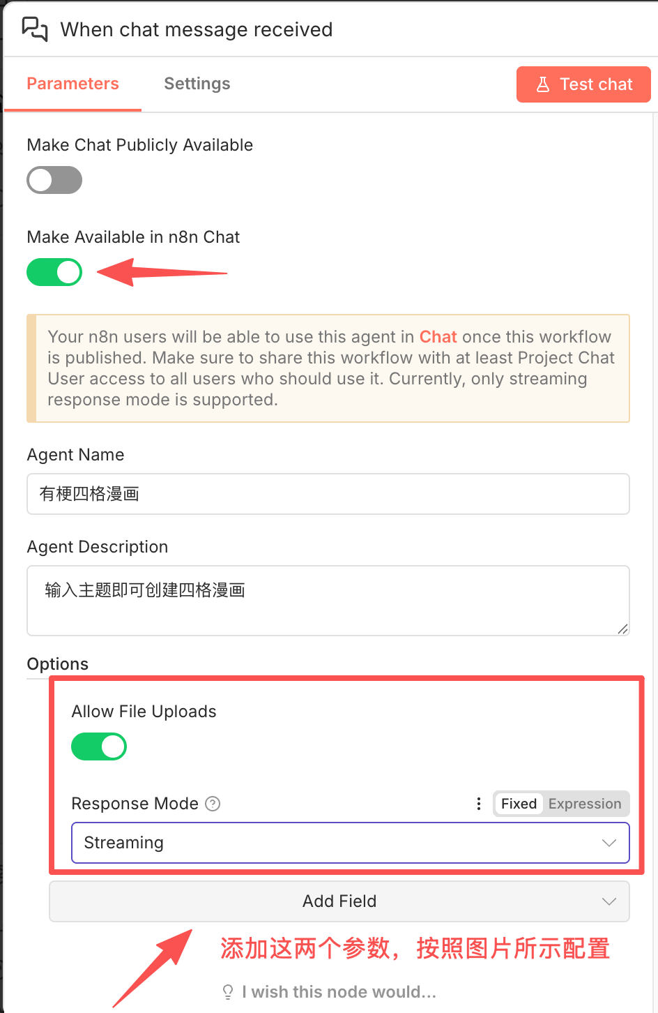 另一个是 Form Trigger(表单触发)。如果你想做一个网页发给朋友玩,或者是想传图片(比如上面的聊天记录截图),用表单更合适。