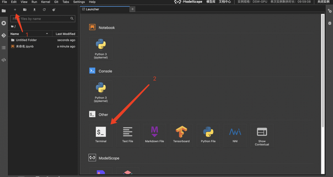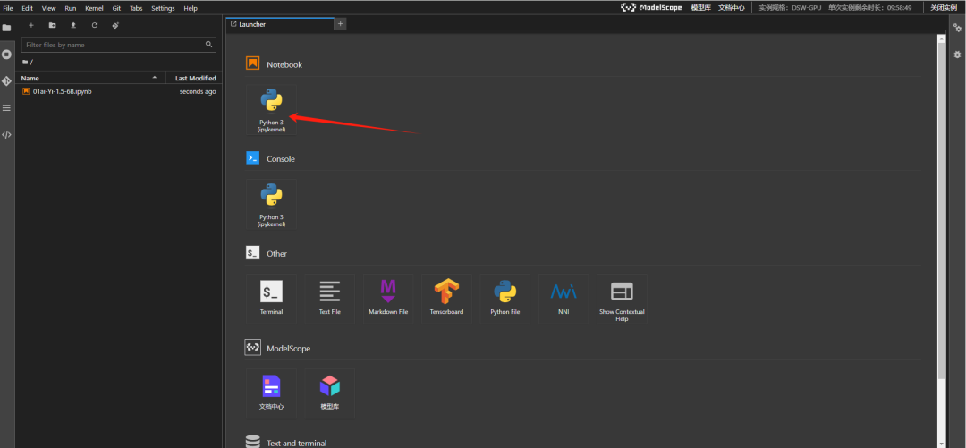 启动约 2 分钟,GPU 环境启动好后点击"查看NoteBook"进入。魔塔社区有 JupyterLab 功能,进入后找 Notebook 标签新建 Notebook(也可在 terminal 执行)。