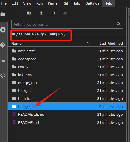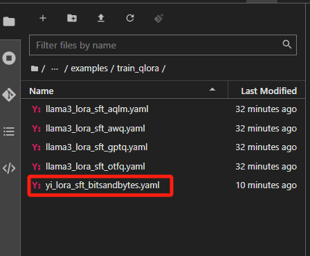 在左侧的文件列表,Llama-Factory的文件夹里,打开examples\train_qlora(注意不是 train_lora)下提供的llama3_lora_sft_awq.yaml,复制一份并重命名为yi_lora_sft_bitsandbytes.yaml。
