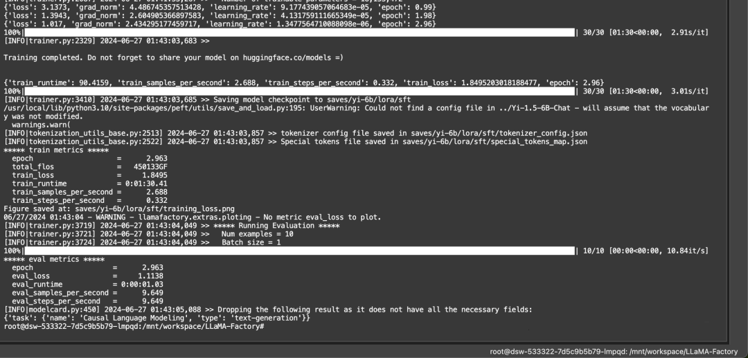 运行过程大概10分钟,看到下面这个界面时,微调过程就结束了。