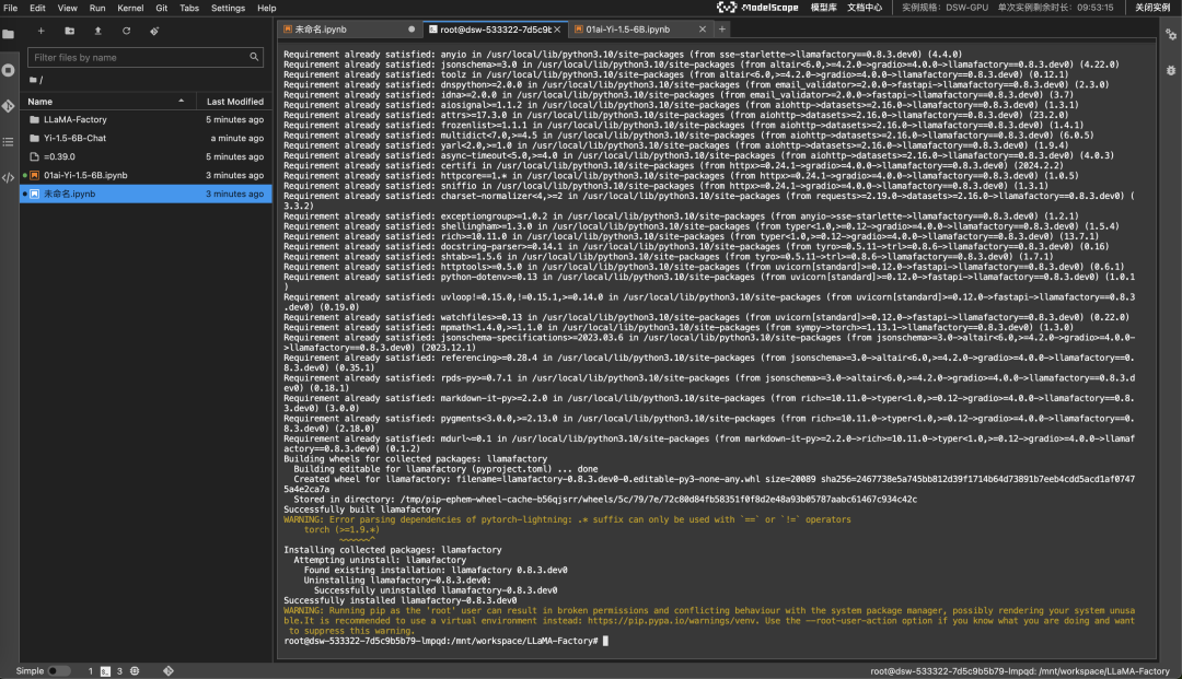 保存刚才对于 yi_lora_sft_bitsandbytes.yaml 文件的更改,回到终端terminal。