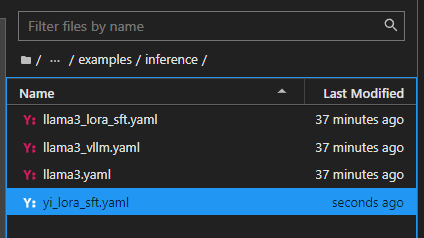 参考Llama-Factory文件夹中,examples\inference下提供的llama3_lora_sft.yaml,复制一份,并重命名为 yi_lora_sft.yaml