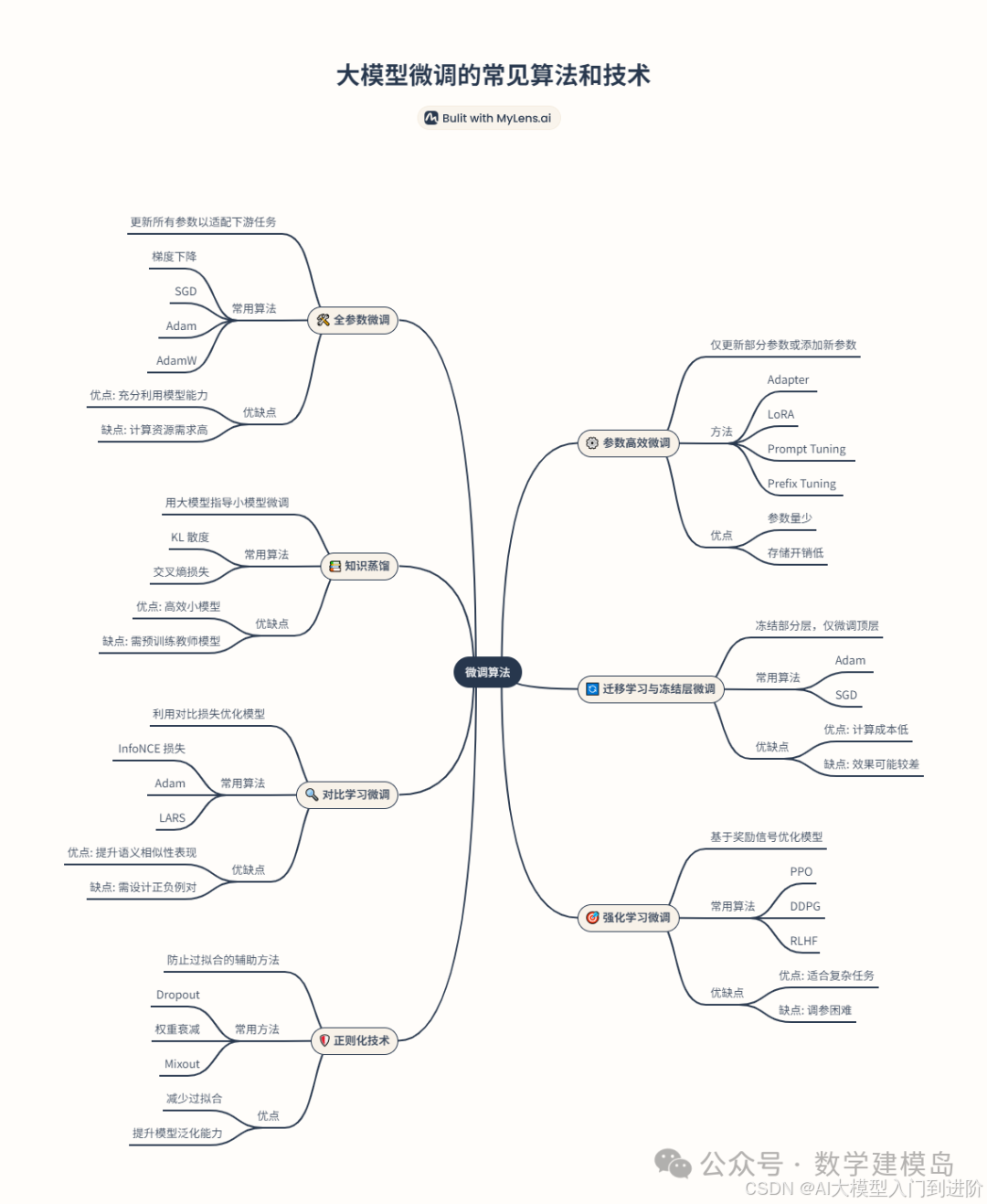 大语言模型的微调方法多种多样,对于初学者来说,常见的几种技术各有特点。我们简要介绍它们的原理、优缺点和适用场景: