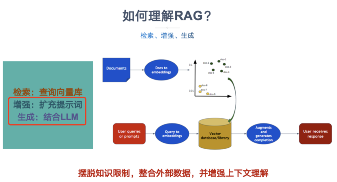 RAG全称是——检索增强生成,检索在前,增强生成在后;因此,RAG的原理其实很简单,检索到问题相关文档,然后把这部分文档交给大模型进行生成。