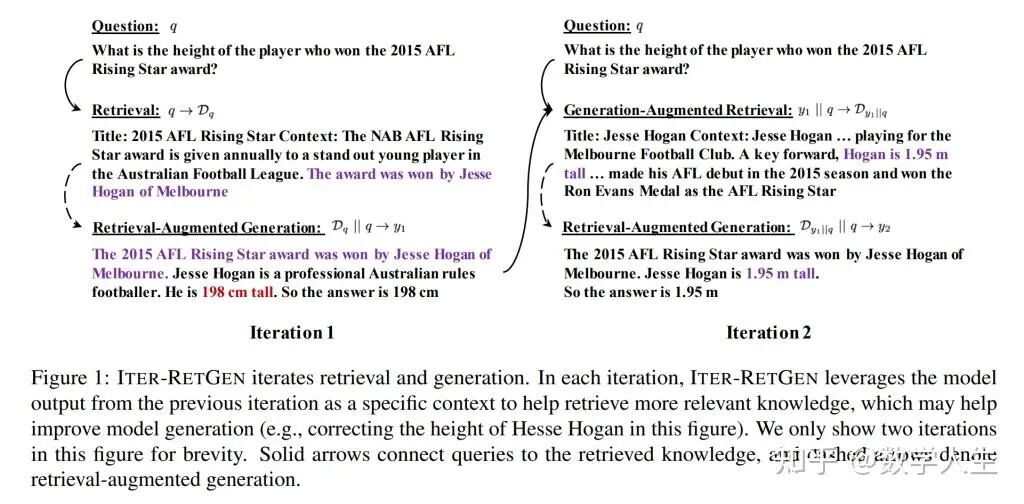 迭代检索是一种基于初始查询和迄今为止生成的文本,反复检索知识库的方法,为LLM(大语言模型)提供更全面的知识基础。这种方法已被证明能够增强后续生成答案的鲁棒性,通过多次检索迭代,提供更多的上下文信息。然而,迭代检索可能会受到语义不连续性和冗余信息累积的影响。ITER-RETGEN提出了一种协同方法,将“检索增强生成”与“生成增强检索”结合起来,用于需要复现特定信息的任务。该模型利用生成的内容作为检索相关知识的上下文基础,从而在后续的迭代中生成更为精准的答案。