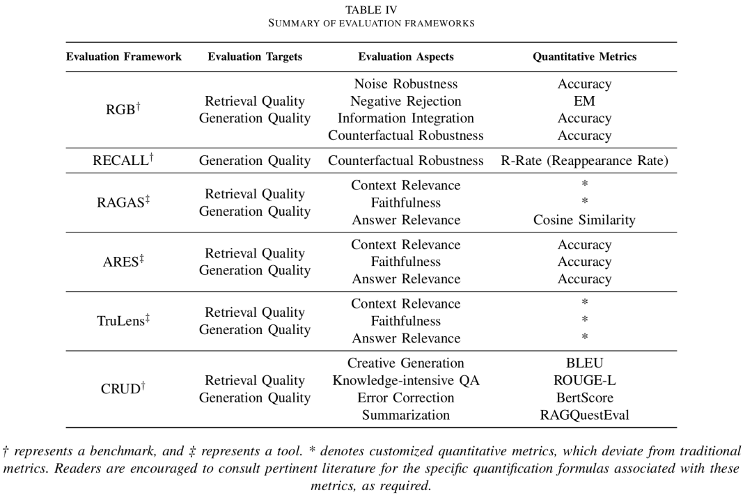 RAG的评价指标如下,其中包含了一些基准线(benchmark)和工具(tool)。