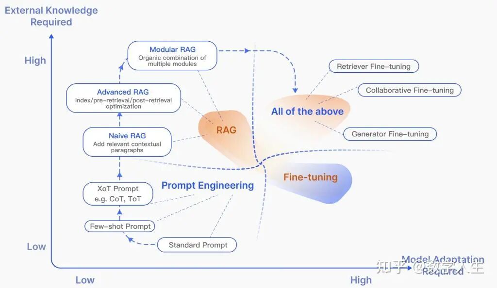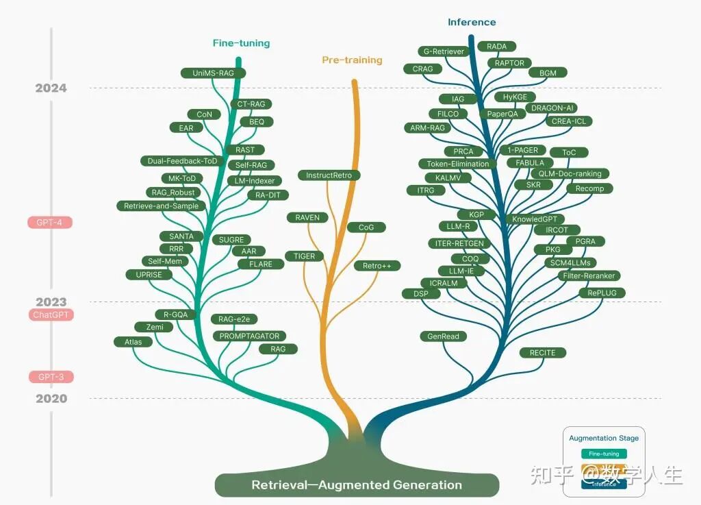 大模型涉及的主要阶段包括预训练、微调和推理。随着大型语言模型(LLMs)的出现,RAG的研究最初集中于利用LLMs强大的上下文学习能力,主要集中在推理阶段。随后,研究逐渐深入,逐步与LLMs的微调过程结合。研究人员还在探索通过检索增强技术,在预训练阶段提升语言模型的能力。下图是RAG(检索增强生成)研究的技术发展路线图。