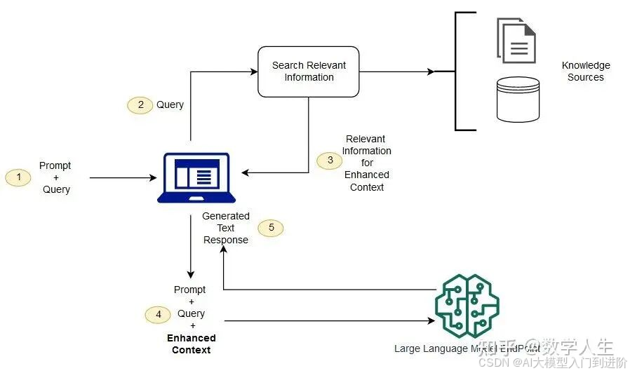 接下来,RAG 模型通过在上下文中添加检索到的相关数据来增强用户输入(或提示)。此步骤使用提示工程技术与 LLM 进行有效沟通。增强提示允许大型语言模型为用户查询生成准确的答案。