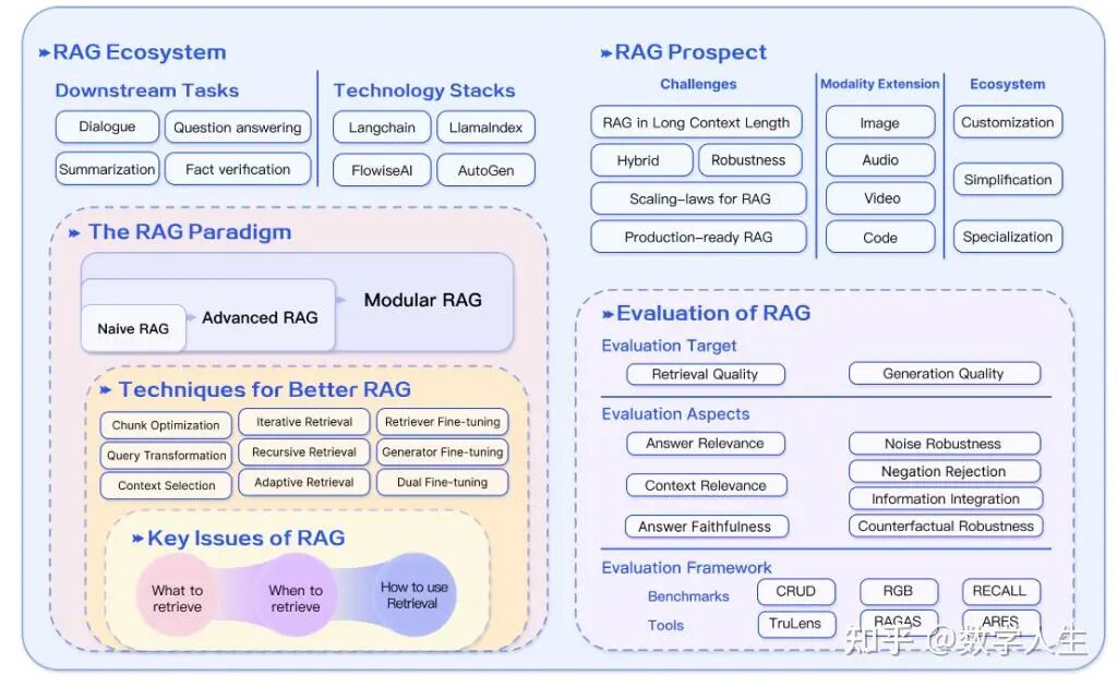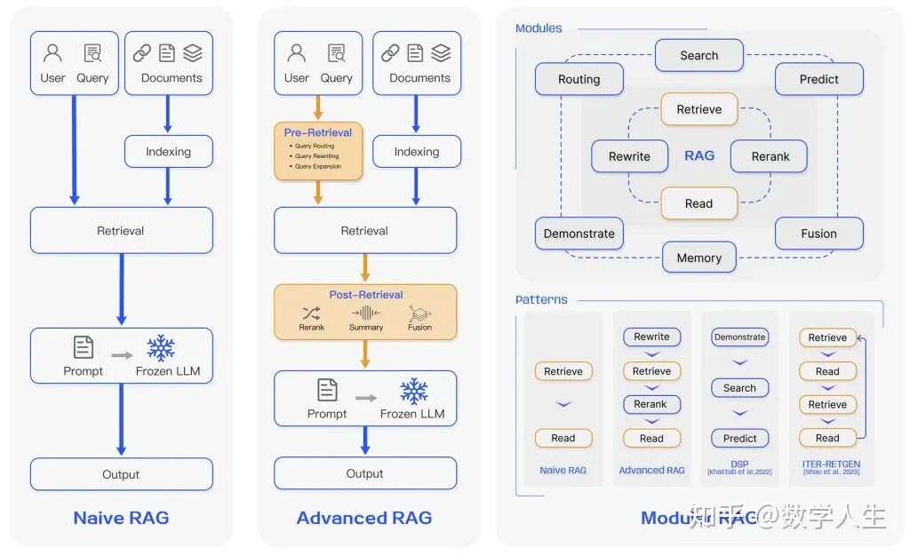 - (右)模块化RAG继承并发展自前述范式,整体展示出更大的灵活性。其特点在于引入了多个具体的功能模块,并可以替换现有模块。整体过程不再局限于顺序的检索和生成,还包括迭代式和自适应检索等方法。