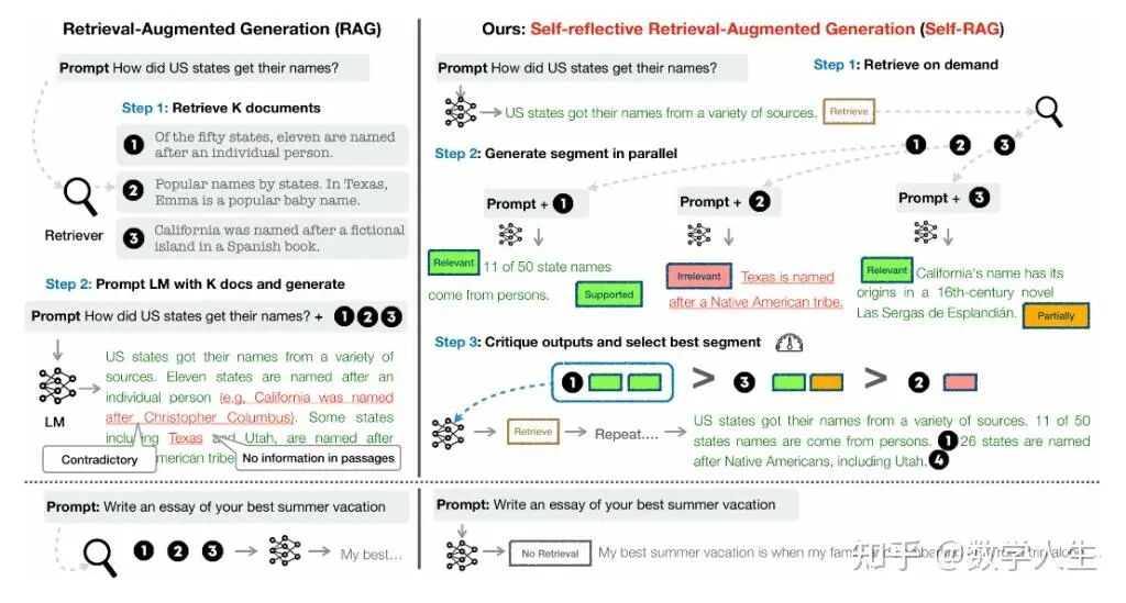 (右)自适应检索侧重于使RAG系统能够自主判断是否需要外部知识检索,并决定何时停止检索和生成,通常使用LLM生成的特殊标记进行控制。