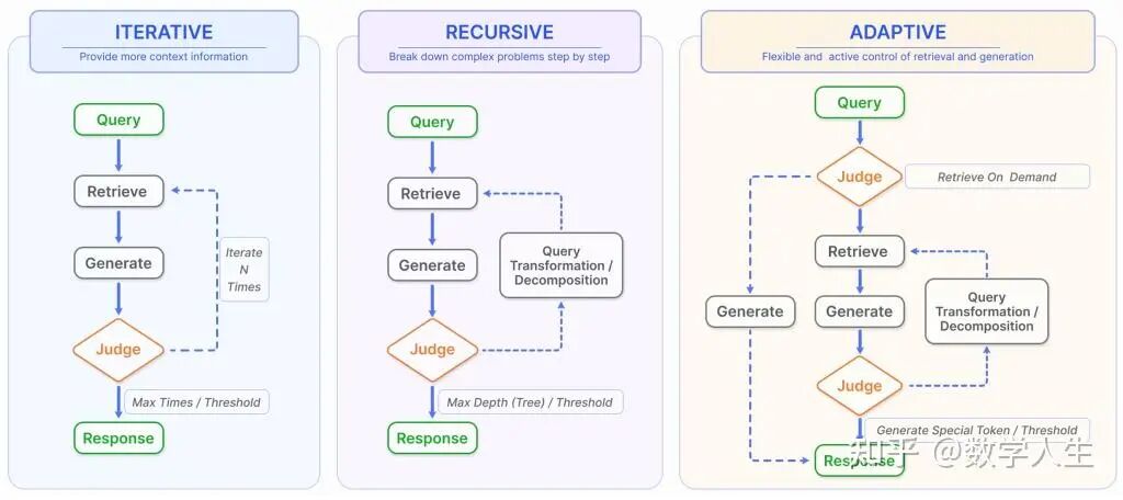 (左) 迭代检索涉及在检索和生成之间交替进行,使每一步都能从知识库中获得更丰富、更有针对性的上下文。