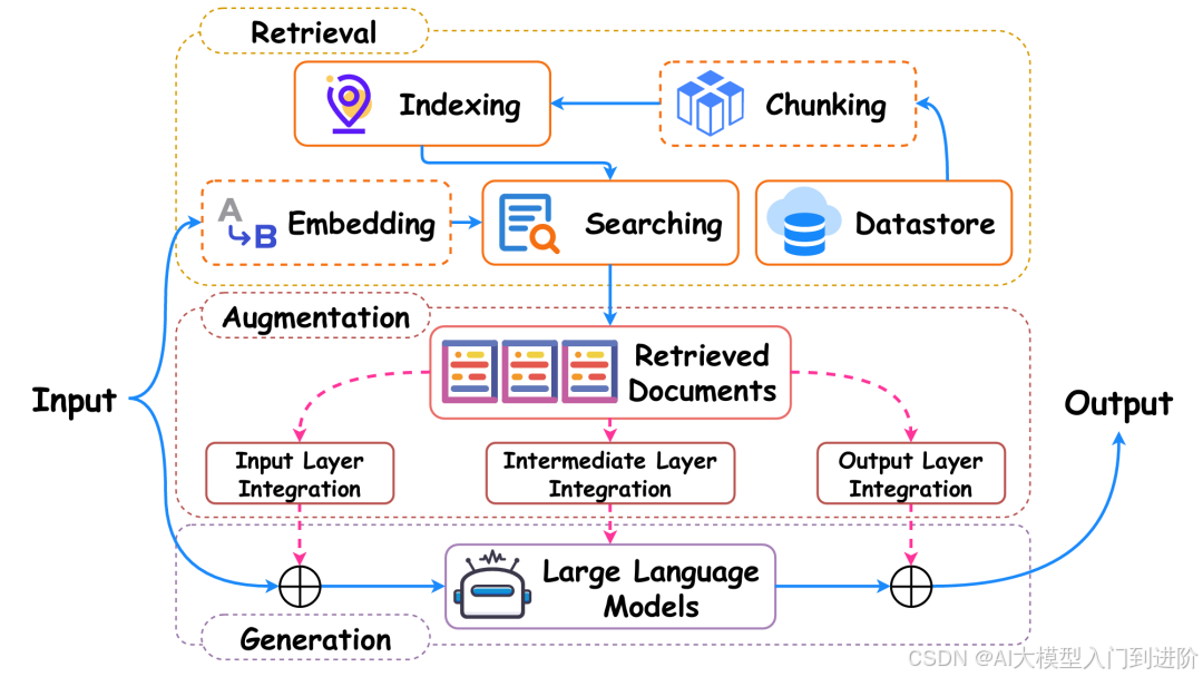 - 生成:将原始问题和检索到的文档块一起输入到大型语言模型(LLM)中,生成最终答案。