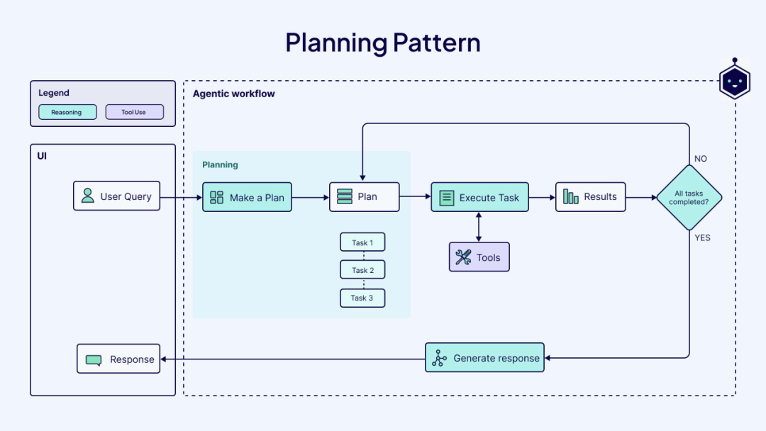 规划模式使智能体能够自主将复杂任务拆解为一系列更小、更简单的子任务,即任务分解。这种模式能降低LLM的认知负荷、提升推理能力,并减少幻觉及其他不准确输出,从而优化结果质量。