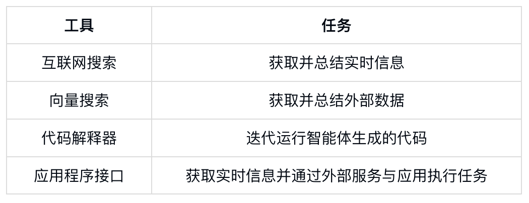 由此,智能体得以接入实时外部信息以支撑决策过程,并执行需协同多方应用的复杂任务。此类工具通常与特定权限体系紧密关联,下表列出了AI智能体的常见工具及其对应功能: