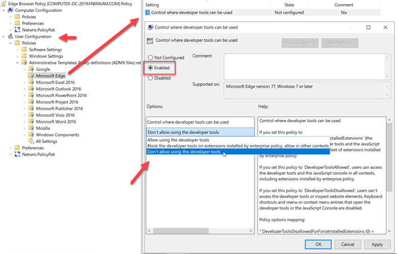 Then navigate to User Configuration > Microsoft Edge and configure the “Control where developer tools can be used” setting as shown in the screenshot below.