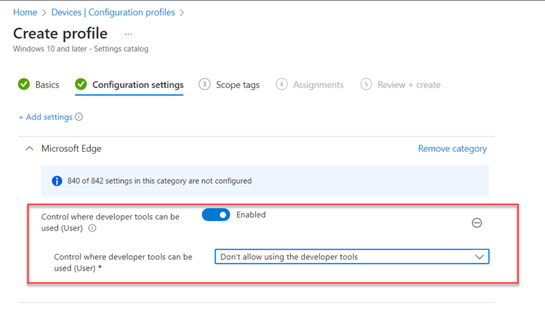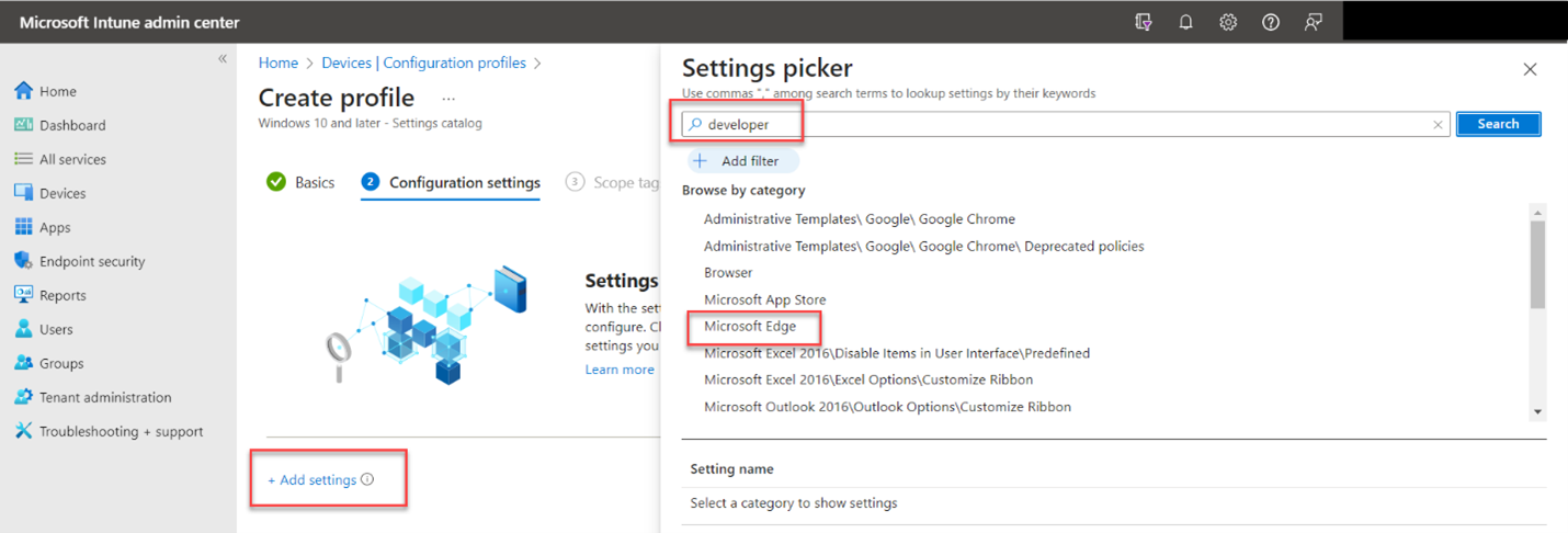 This time we will restrict user access to the developer tools in the Edge browser. To make it easier to find the desired setting, let’s use the Settings catalog for the profile type rather than the Administrative templates. Using the Settings Catalog, do a search for the word “developer” and then click on Microsoft Edge in the results as shown below.