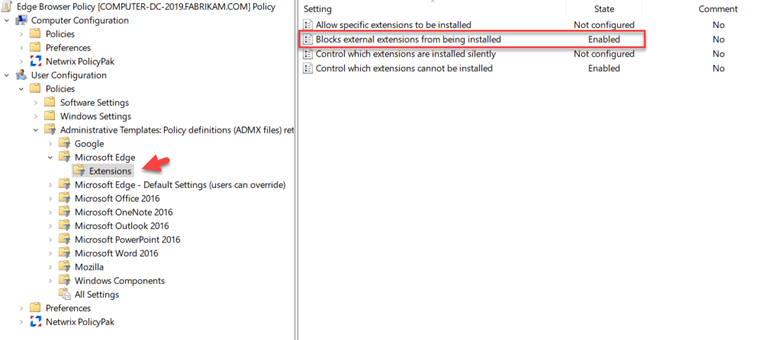You would then follow this up by enabling the “Blocks external extensions from being installed” setting to prevent all other extensions from installing as shown in the screenshot below.