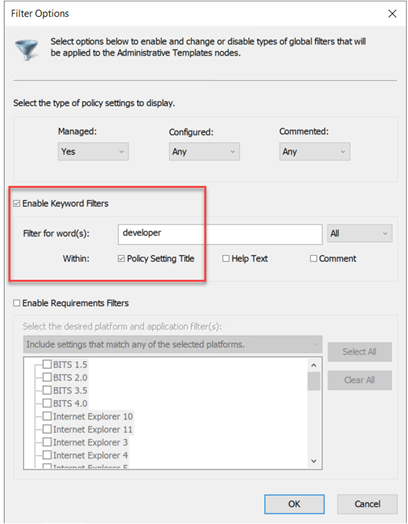 In Group Policy, you can use the Filter to quickly find the exact setting you need. Simply filter the word developer as shown in the screenshot below.