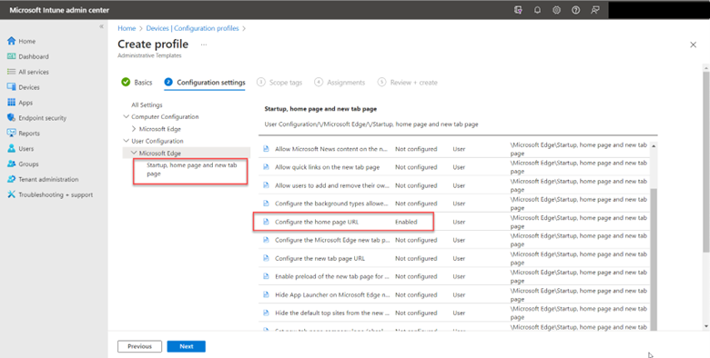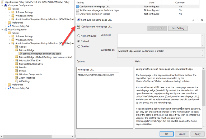We will wrap up this discussion by assigning a mandatory home page for all users. You can find this setting in Group Policy by going to Administrative Templates > Microsoft Edge > Startup > and enabling the “Configure the home page URL” setting and inputting the desired home page.
