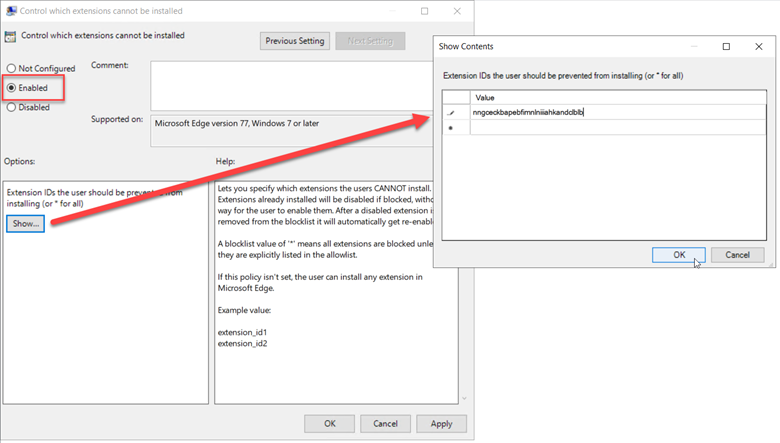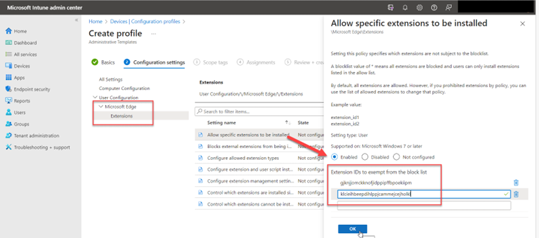 You want to have control over what browser extensions your users will have. Let’s start with which extensions will be allowed. Using Intune, use Administrative Templates once again as your profile type and navigate to Microsoft Edge > Extensions and enable “Allow specific extensions to be installed.” You will then have to input the ID for each web extension. I the example below I have added the ID for Microsoft Translator (gjknjjomckknofjidppipffbpoekiipm), followed by Adobe Acrobat (klcieihbeepdihlppjcammejcejholkl). Note that the extension IDs are different for each web browser.