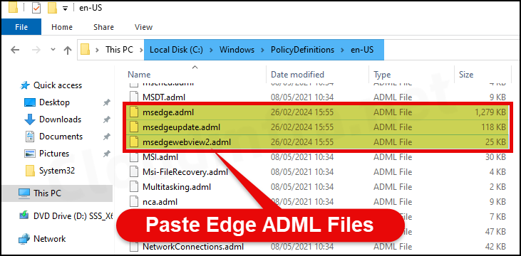 - Paste the .adml files into the folder %systemroot%\PolicyDefinitions\en-US folder.