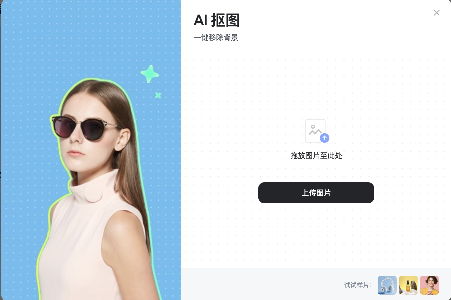 稿定设计的AI抠图功能基于自研的场景化语义分割模型,针对人像、商品、图形等常见场景优化:例如人像抠图模型重点学习面部特征与毛发纹理,商品抠图模型针对金属、布料、玻璃等材质的边缘处理优化,确保在复杂场景下仍能快速输出精准结果。这种“场景化训练”是AI抠图比通用工具更高效的关键——无需用户手动调整参数,模型已提前适配常见需求。