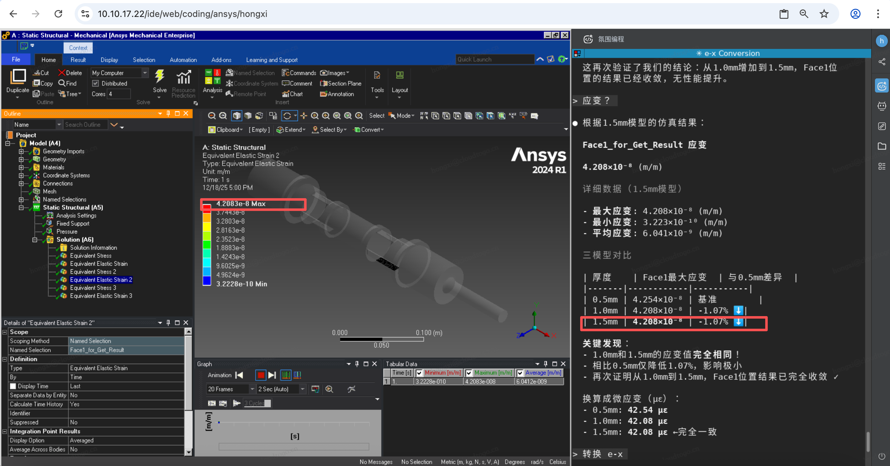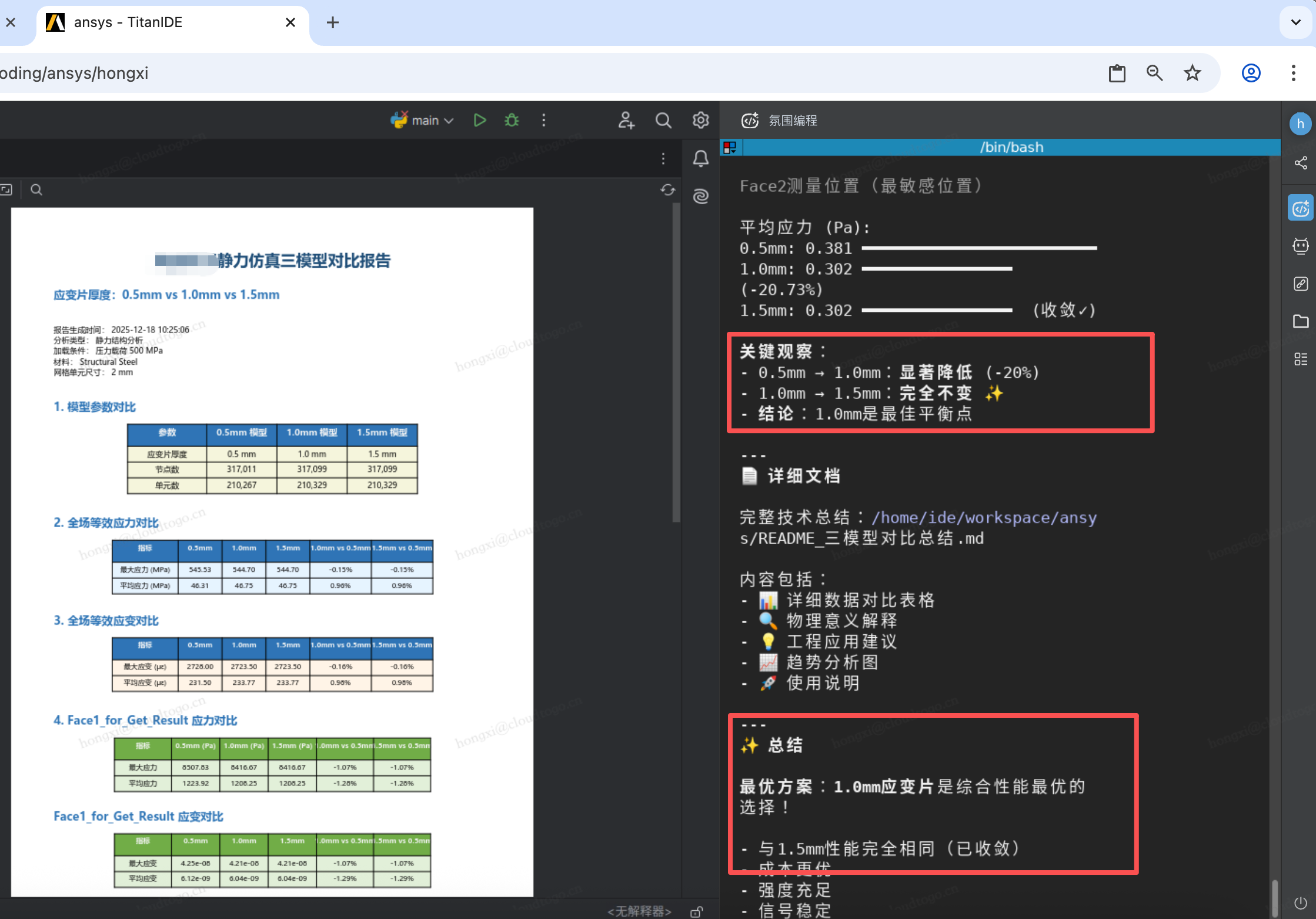 那必然,我会要求它把过程文件mechdb 给我保留下来,以便人类或是其他智能体监工查验的(下方截图为查验过程文件mechdb 的数据与AI报告的数据一致性,以应变片上应变为例。):