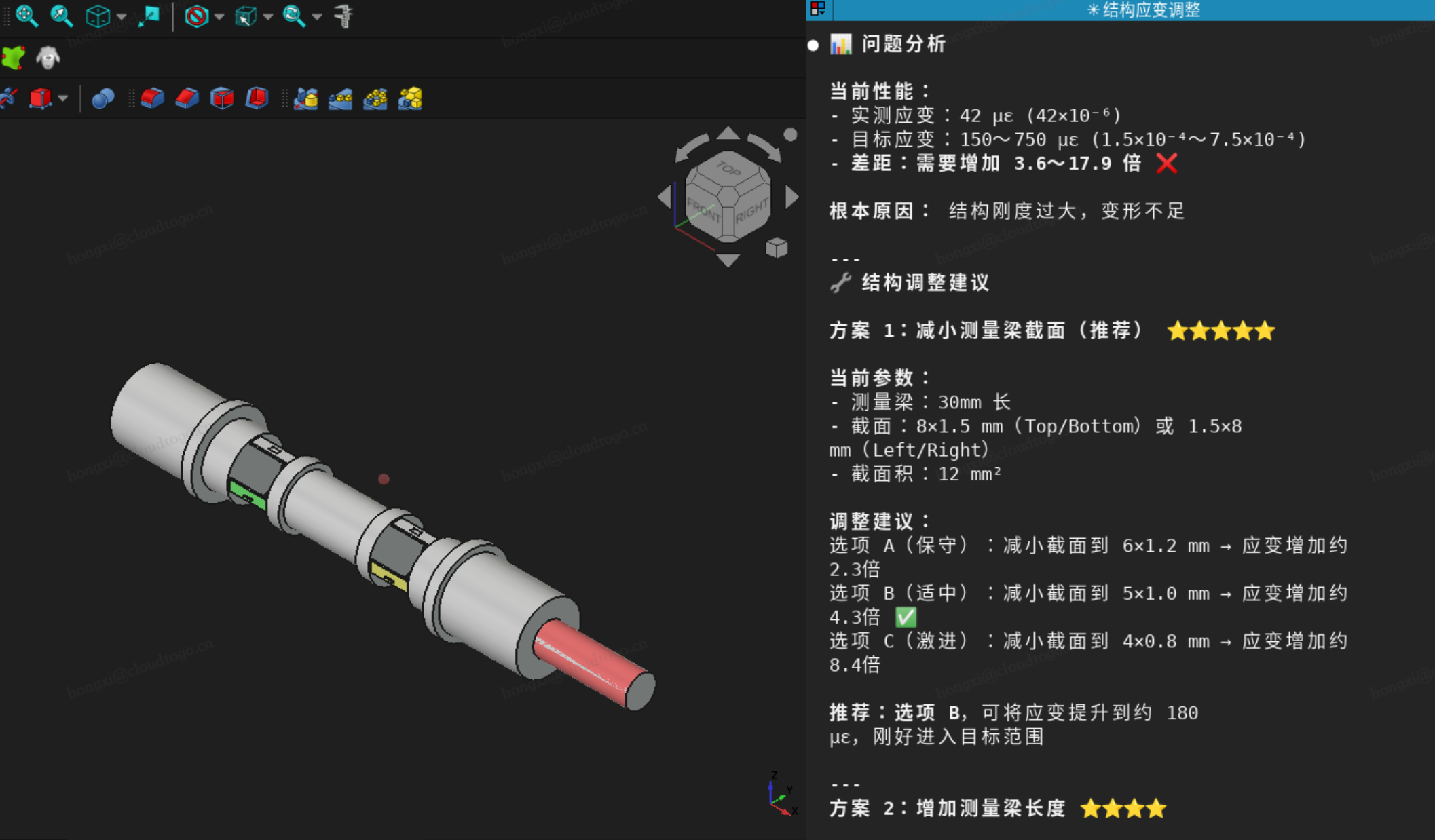 “目前你设计的结构,在500Mpa 测试下,应变片应变42x10-6(με),