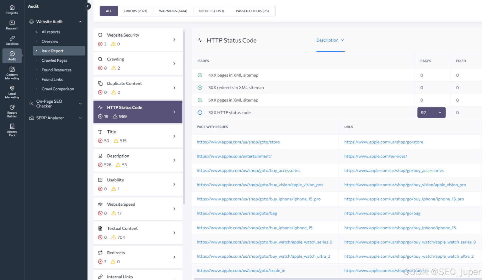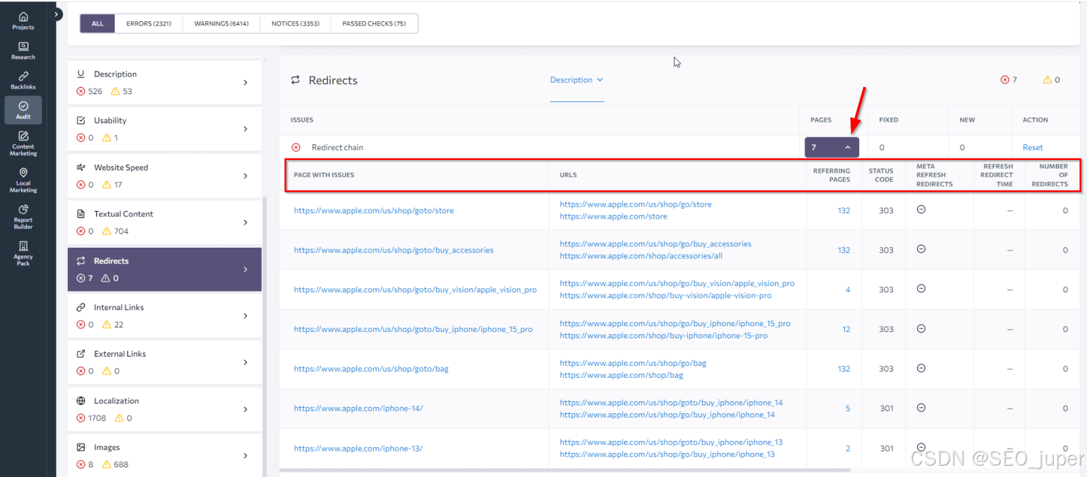 - 浏览审计报告时,请在网站审计左侧栏的“问题报告”标签页中查找。点击HTTP状态码,查找所有带有3XX重定向的问题组。