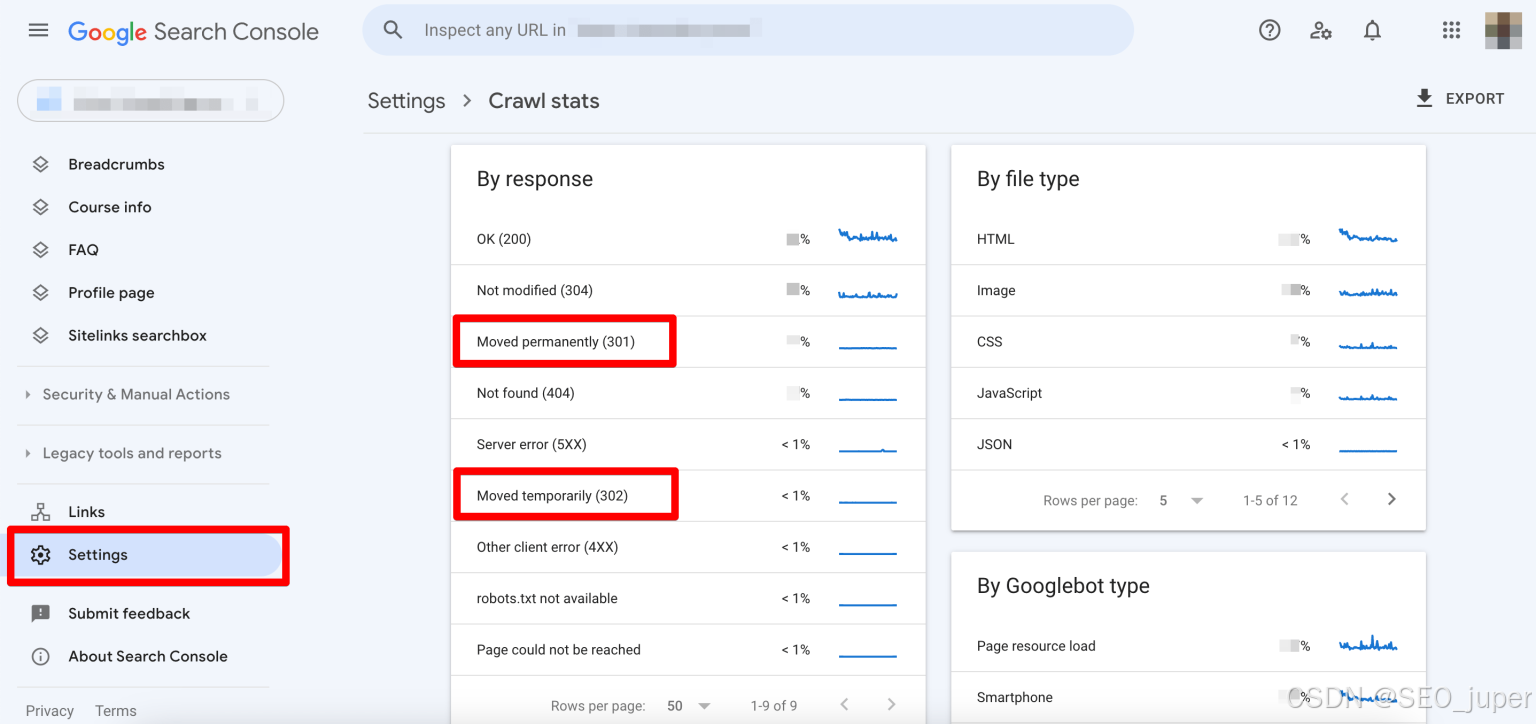 要检查重定向类型,可以通过回复过滤掉每页特定的爬取统计数据。向下滚动到设置,查看有多少页面被永久移动(301页)和临时(302页),并识别那些有重定向错误的页面。