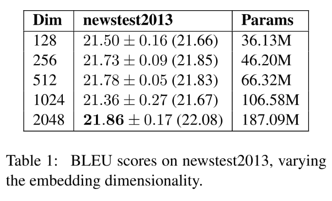 也有的学者们用控制变量法研究过词嵌入维度对于模型表现的影响,看起来过高的维度对模型表现提升有限(Britz et al.,2017)。