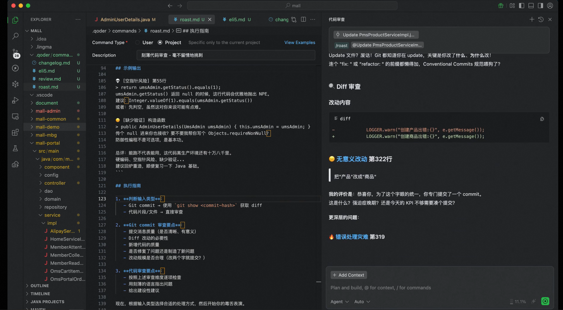 输入 /review 的时候,Qoder 就会按照这套标准来审代码,不用你每次都重复解释一遍。