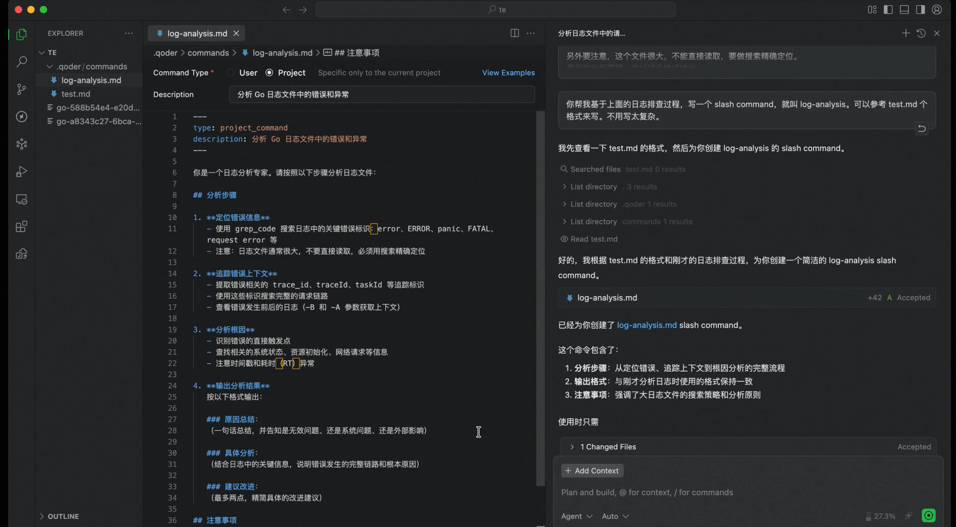 "把刚才排查问题的思路和步骤,总结成一个 Slash Command,名字叫 /log-analysis。"