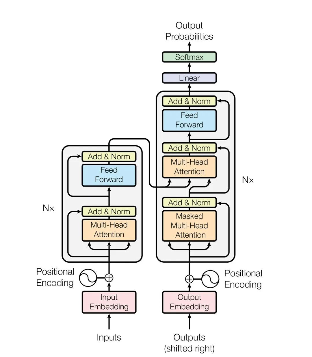 这是 Transformer 架构的原理图,我们从下往上重点关注输入(红)、注意力/解析(橙)与前馈/输出(蓝)三个部分。