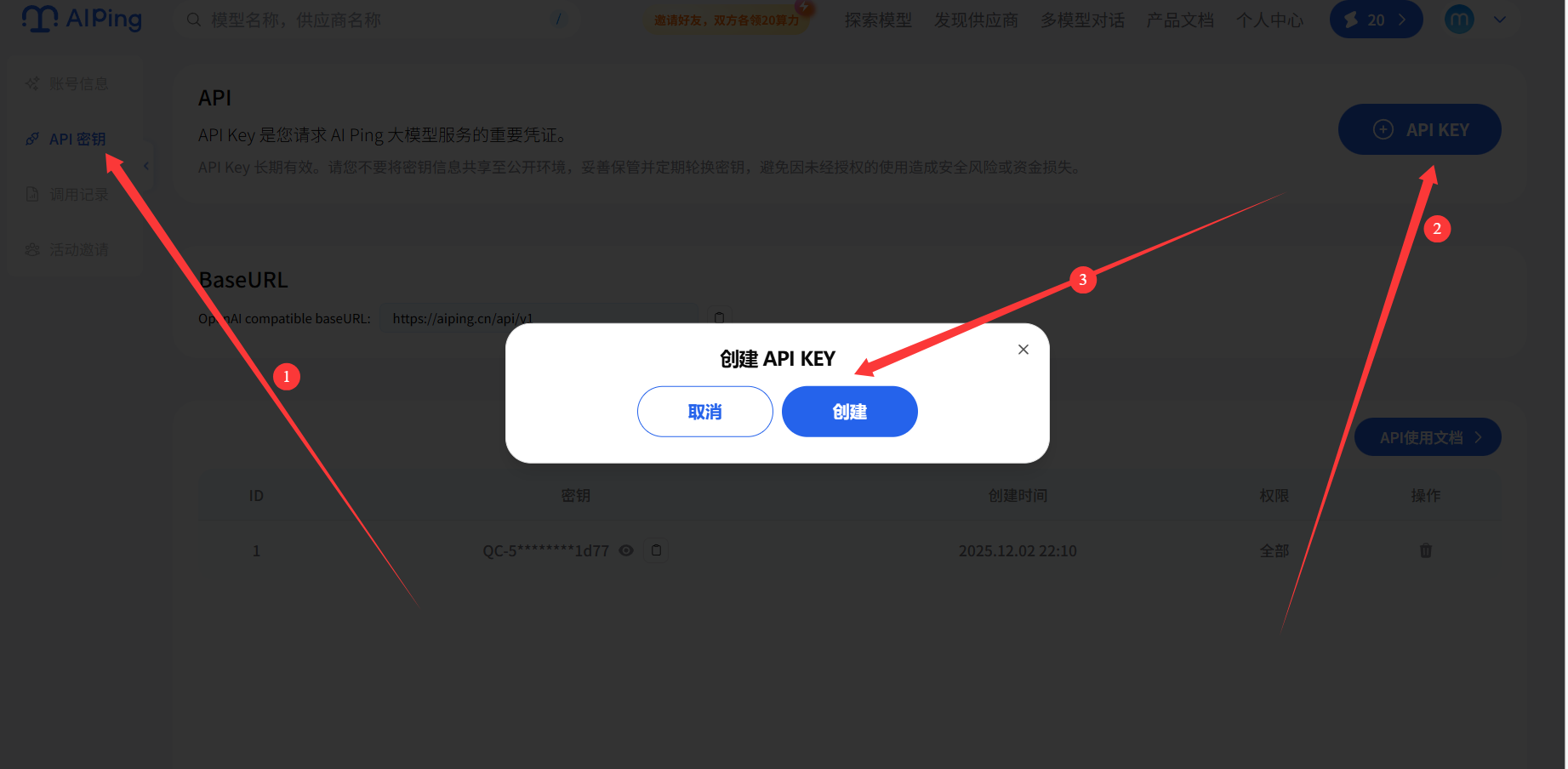 - API 地址 (Base URL):https://aiping.cn/user/apikey。