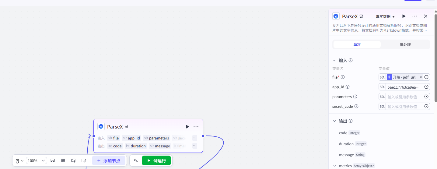 (配图说明:从左至右依次为:开始节点 -> TextIn 解析插件 -> 大模型推理 -> 结果回写)