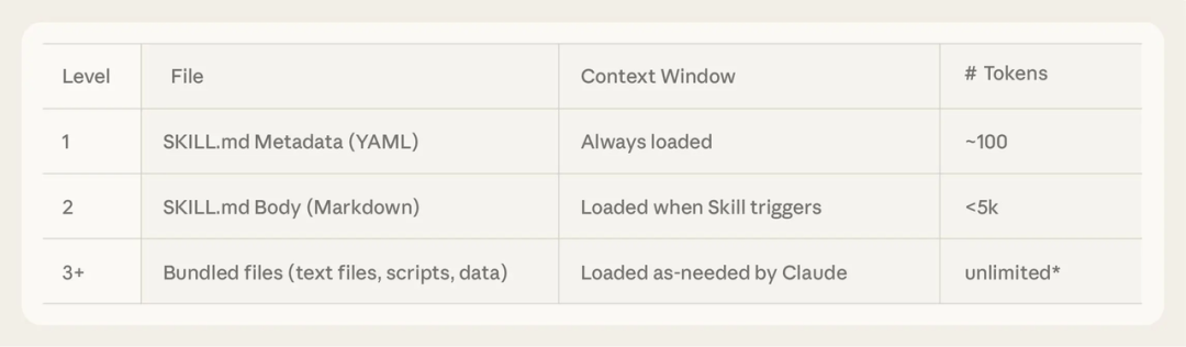 - 第二层:SKILL.md主体,当Agent 觉得某个skill相关时才加载,包含核心指令;