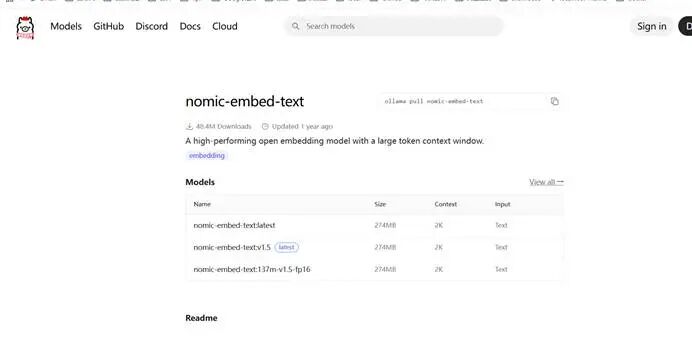 4)同理,下载nomic-embed-text文本嵌入模型,用于构建个人知识库: