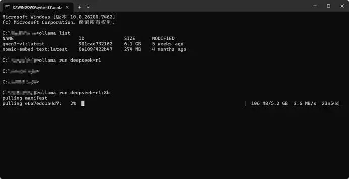 因为本机之前已经安装过qwen3大模型,所以,执行命令会直接进入qwen3大模型对话流,因此,更换deepseek大模型为例: