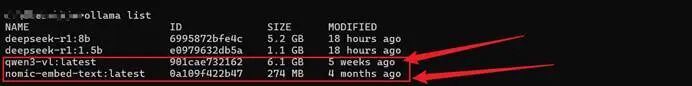 5)准备完成后,Ollama中应当存在:qwen3-vl和 nomic-embed-text 模型