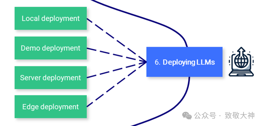 - 服务器部署:大规模部署 LLM 需要云服务(参见 SkyPilot)或本地基础设施,通常利用优化的文本生成框架,如 TGI、vLLM 等。